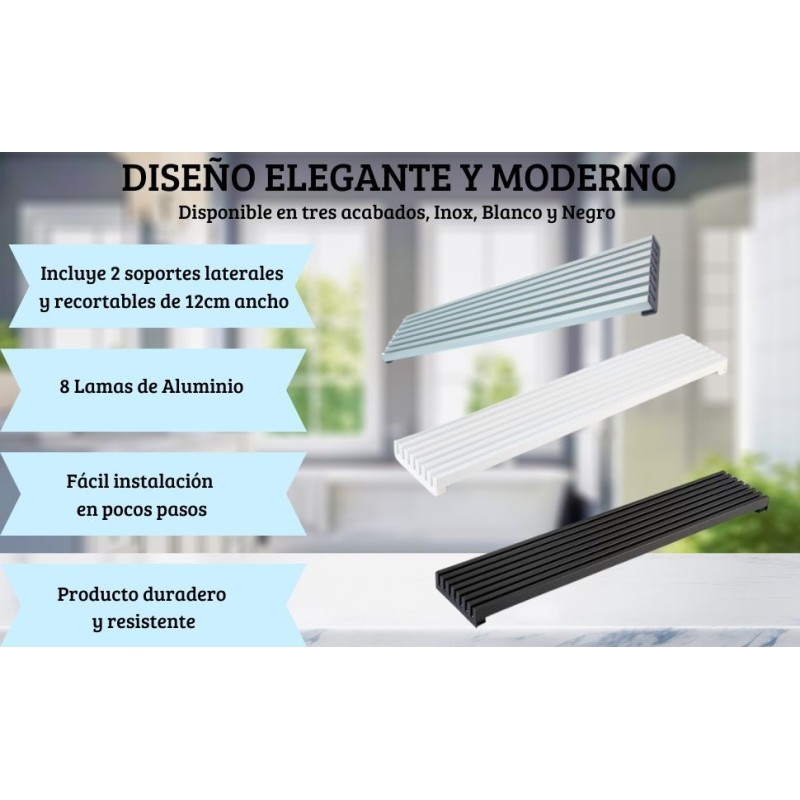 Con medidas de 60 cm y 90 cm, y disponibles en 3 acabados (inox, blanco y negro), esta rejilla es ideal para instalarse en cualquier cocina moderna. Además, su fácil instalación permite que puedas montarla tú mismo, simplemente fijando los soportes con tornillos de madera y encajando las lamas. Este producto es altamente resistente al desgaste y la corrosión, lo que asegura una larga vida útil. Todos nuestros productos están sometidos a rigurosos controles de calidad y cumplen con las normativas ROHS, UNE y TÜVRheinland, ofreciendo la máxima seguridad para ti y tu hogar.