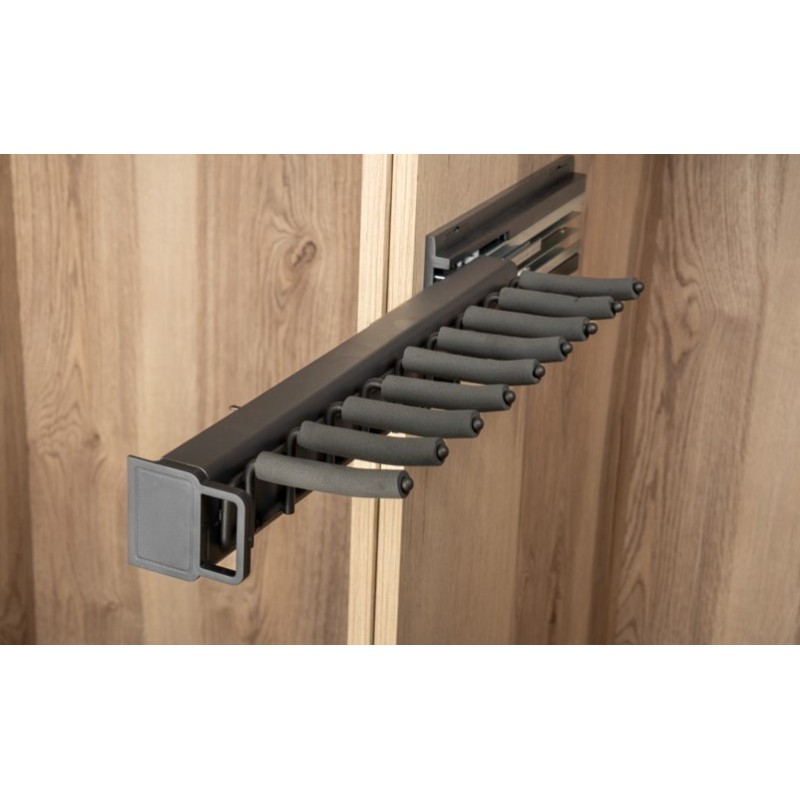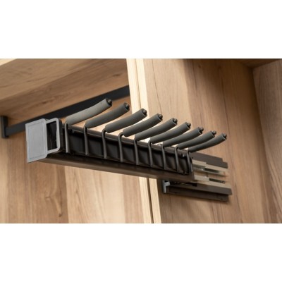 Corbatero Lateral Aluminio Extracción Total y Freno – Organizador Armario y Vestidor. Accesorio para armarios o vestidores presenta un diseño que maximiza la utilización del espacio. Su característica extraíble facilita el acceso a tus corbatas, cinturones o bolsos desde el lateral del armario, manteniéndolos organizados y al alcance de la mano. No solo ahorra espacio, sino que también agrega comodidad y funcionalidad a tu rutina diaria de vestuario. Medidas 170x 450 x110mm. En color antracita, un color discreto y sofisticado para su armario o vestidor.