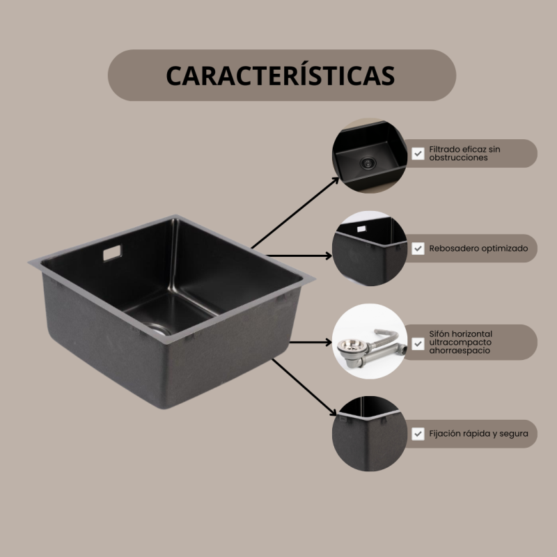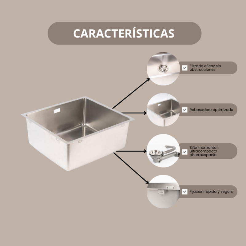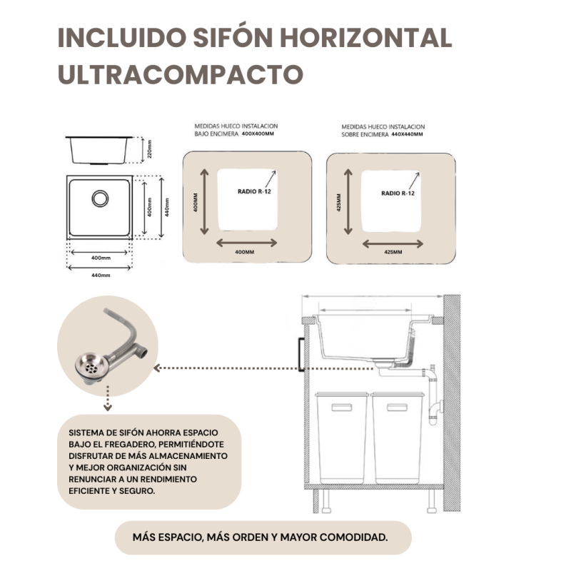A diferencia de otros fregaderos, este modelo incorpora un sifón de diseño horizontal que ocupa menos espacio bajo la encimera, permitiendo: